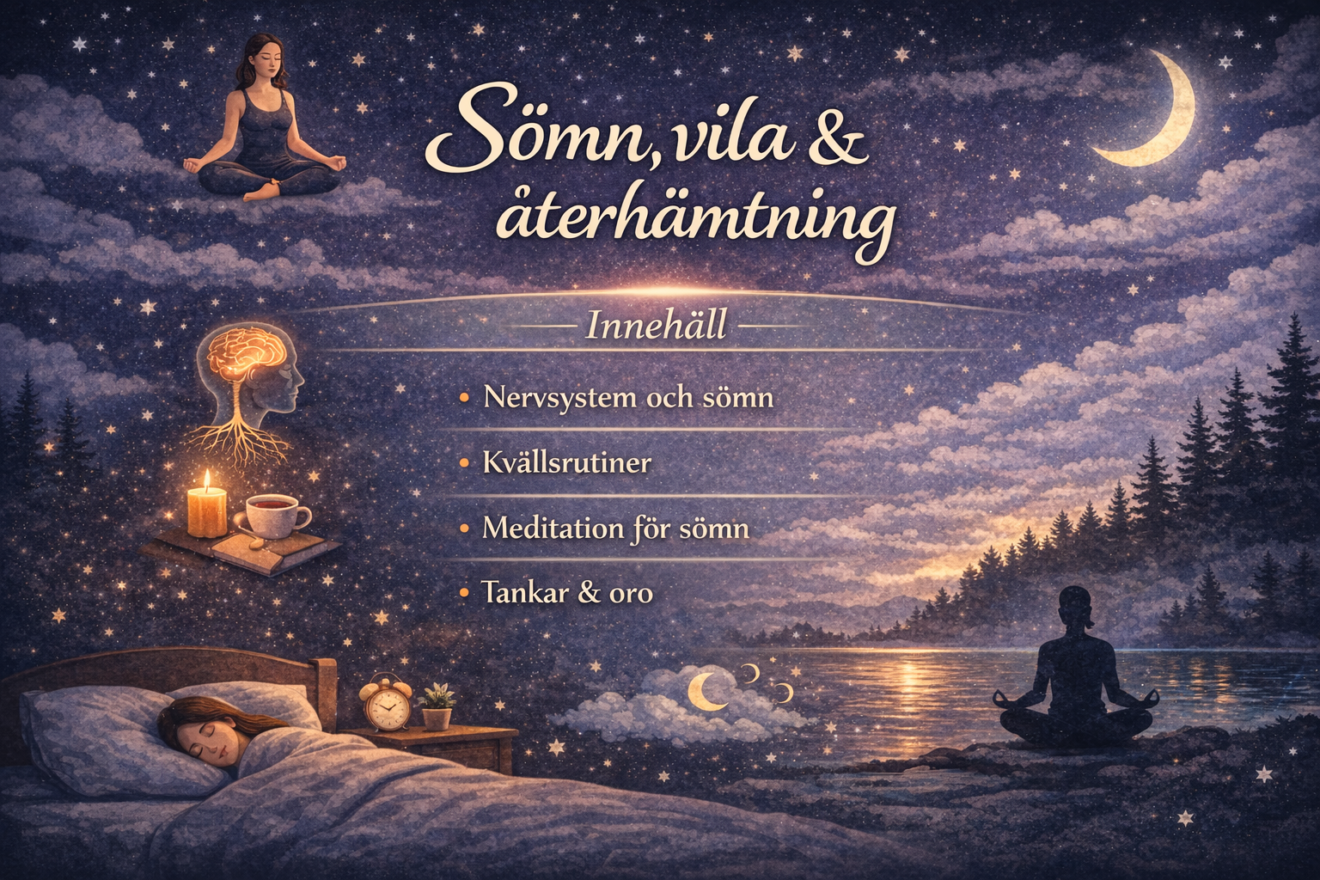 En lugn och praktisk kurs för dig som vill förbättra din sömn och ge kroppen den återhämtning den faktiskt behöver. Här får du både förståelse och konkreta verktyg, så att du kan somna lättare, sova djupare och vakna mer utvilad.